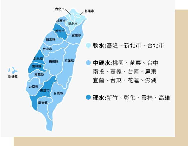 以台灣地區來說,大台北地區及基隆屬軟水區域,這之外的其他縣市則偏中硬水或是硬水。